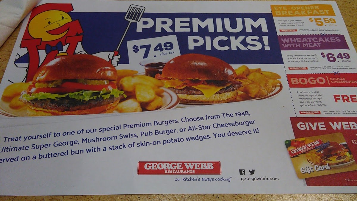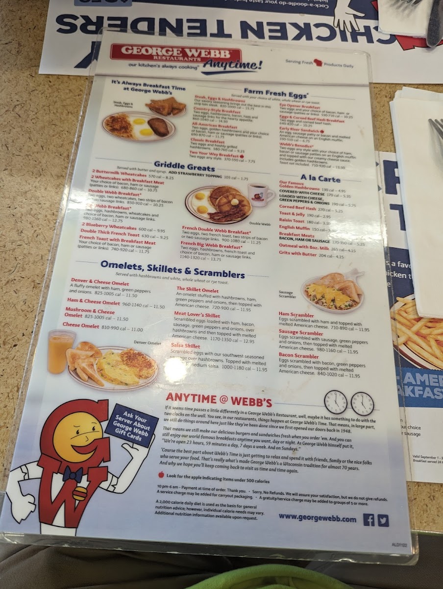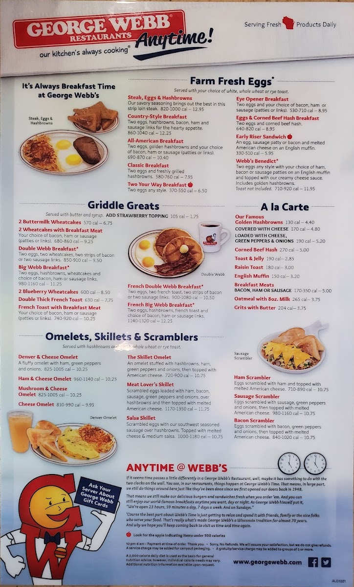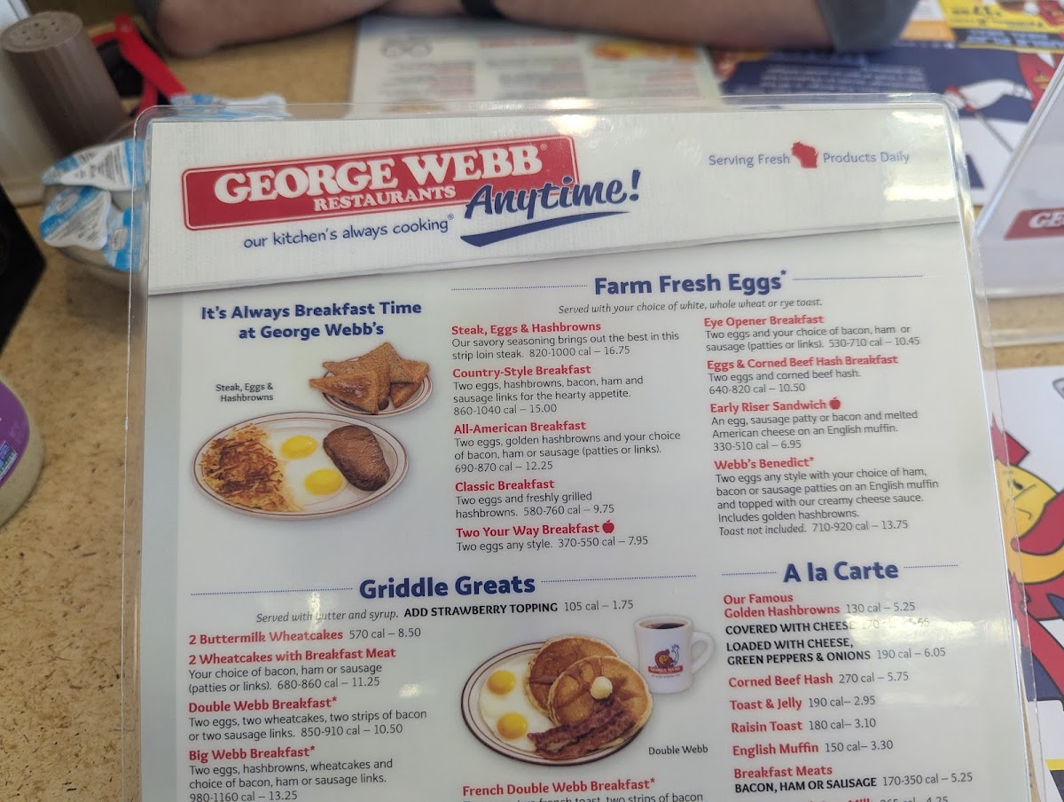 Two eggs, hashbrowns, wheatcakes and choice of bacon, ham or sausage links.